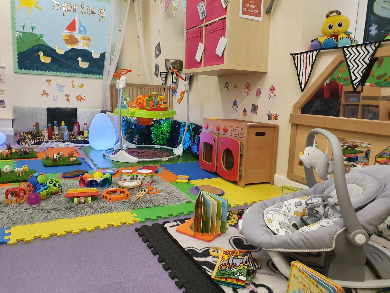 The cosy area is ideal for exploratory, imaginary and physical experiences. The children can explore the toys and resources around them such as the small world toys, exploratory tubs, treasure baskets etc, use their imagination skills in the form of the role play kitchen and the dressing up, and the children can also gain control of their bodies through active indoor and outdoor play.