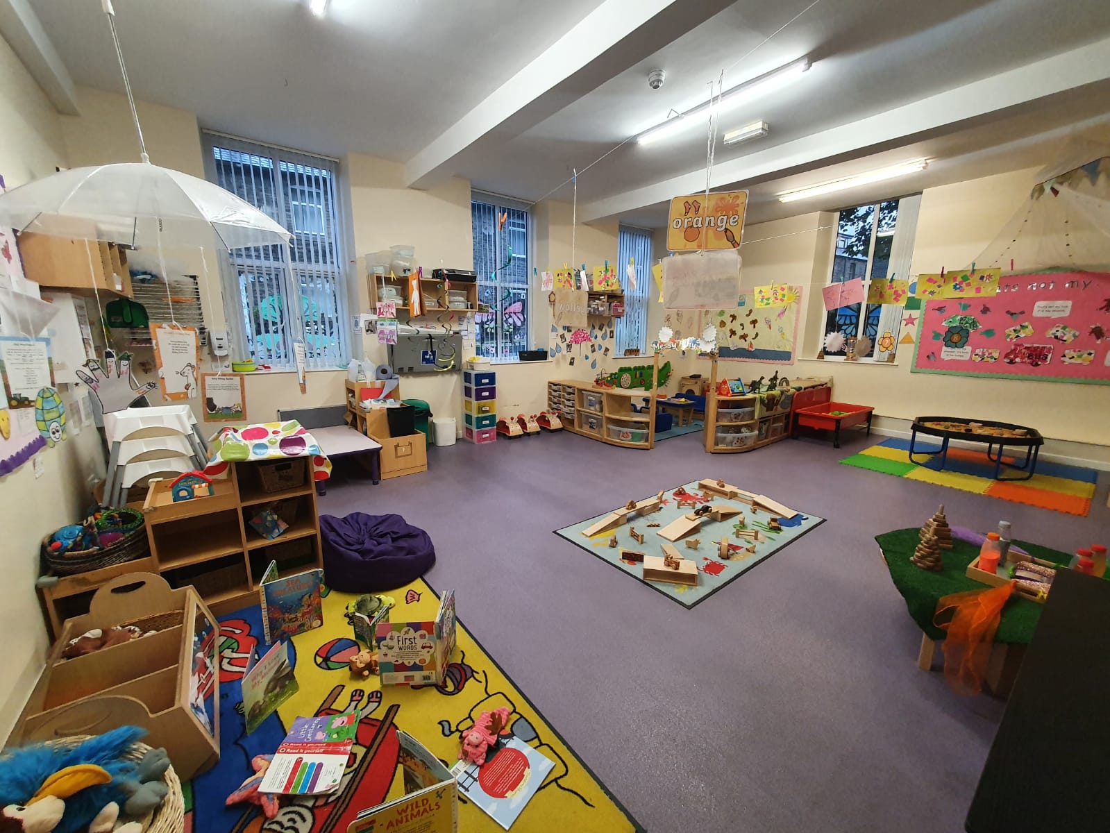 The comfortable area offers a cosy den where the children can go and relax, listen to stories, sing songs whilst in a group environment, or simply enjoy the comforts individually.The non-slip hard floor area is perfect for the children to explore their creative side and experience all the messy activities we have to offer. The messy activities promote sensory exploration, textured play as well as craft and cooking experiences.