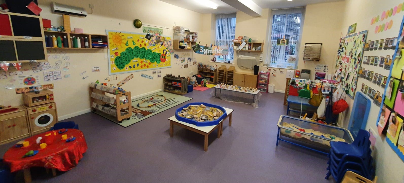 The room offers resources needed for babies to learn, explore and develop. The main areas of provision in the Caterpillar/ Baby Room are Physical, Exploratory, Imaginary, Comfortable and Messy/Creative. The room has a variety of sound and texture, stacking and building toys as well as shakers which provide valuable ways of learning through play.